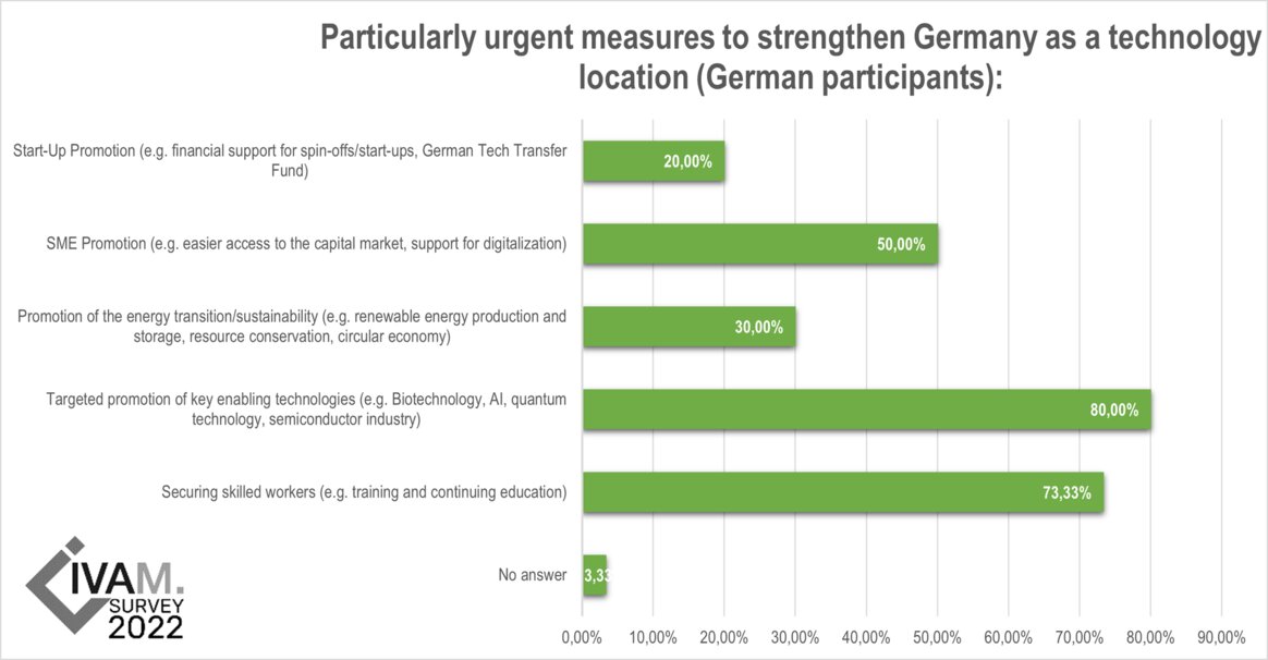 The points of targeted promotion of key enabling technologies (e.g. biotechnology, AI, quantum technology or semiconductor industry) and the issue of securing skilled workers are perceived as particularly urgent. 80% or 73.3% of respondents agree with this point.