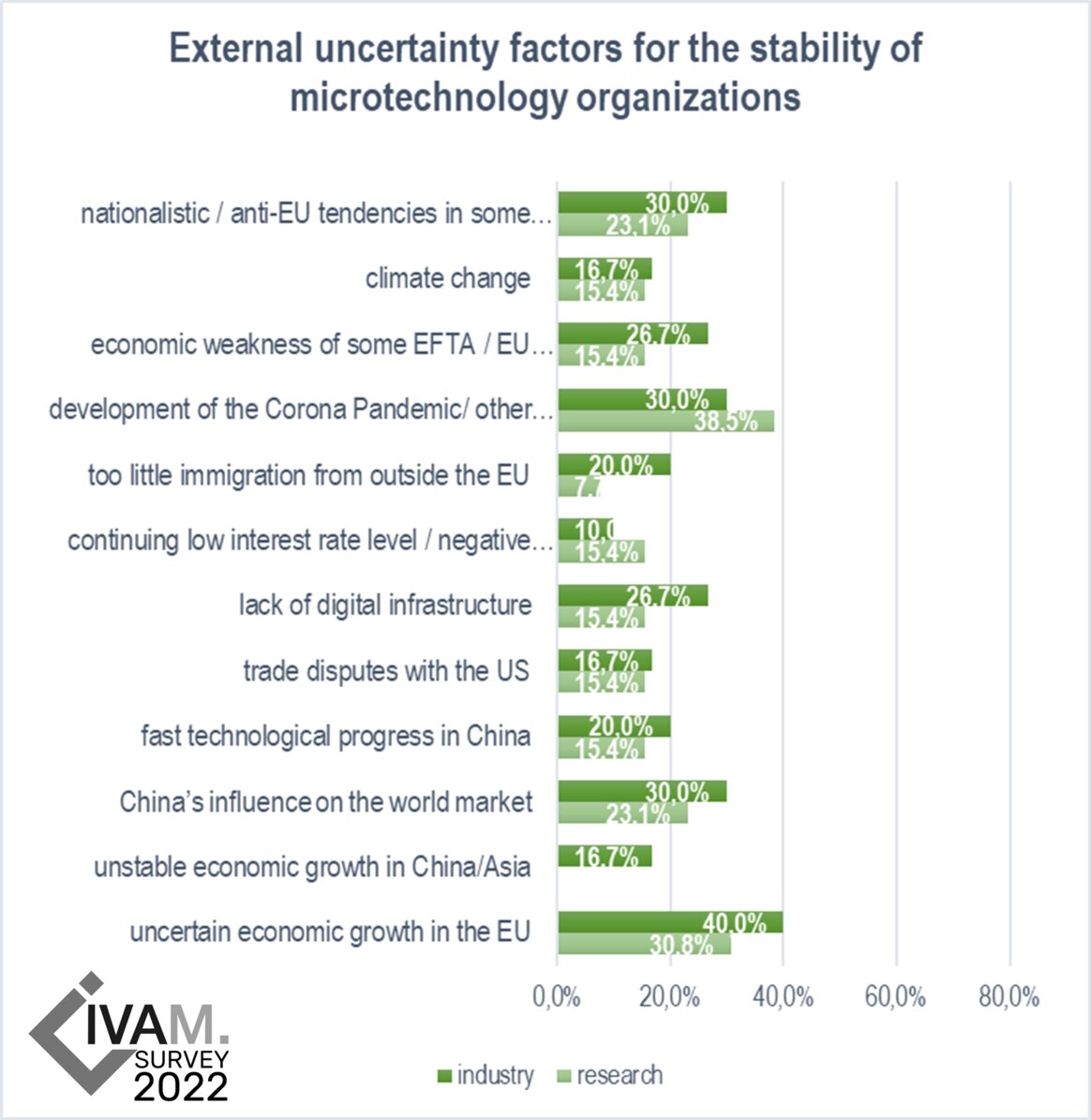 For more than ten years, the IVAM Microtechnology Network has been asking the microtechnology industry in Europe at the beginning of each year about its economic situation, strategies and trends. In February/March 2022, more almost 3,000 companies and research institutes in Europe have been asked about their economic situation and expectations, their international activities, market and application trends, drivers for innovation, and uncertainty factors for the stability of their organization.